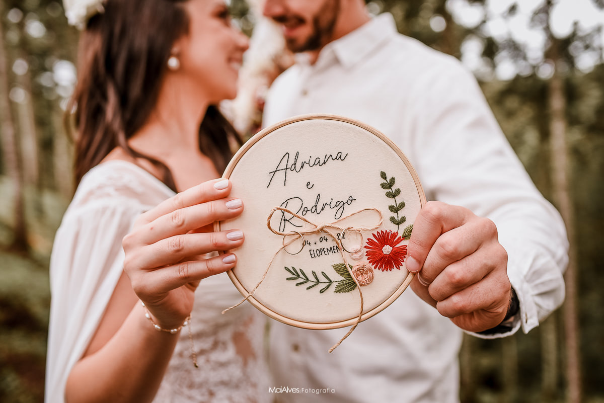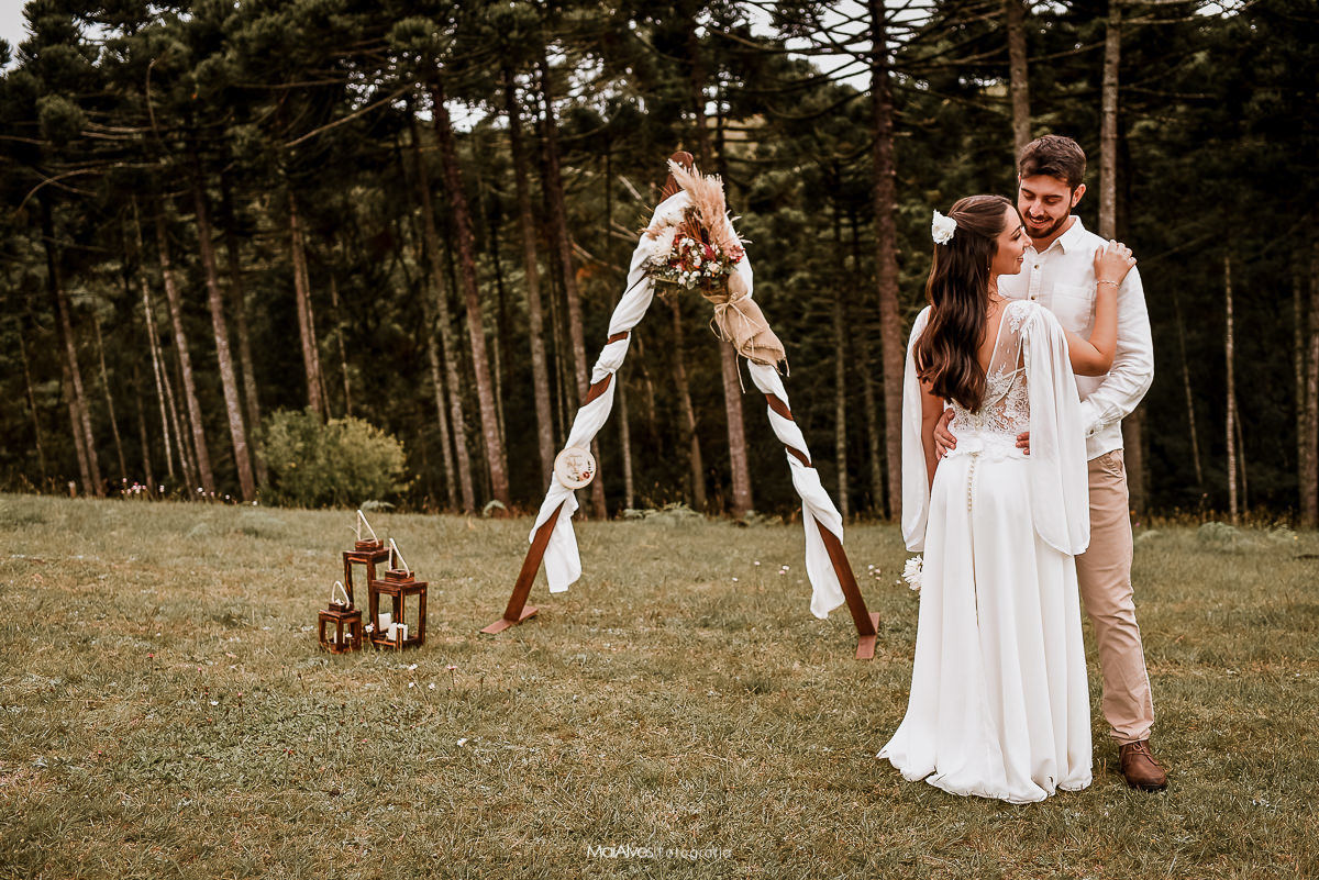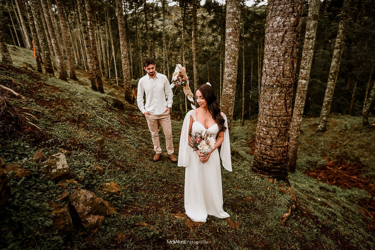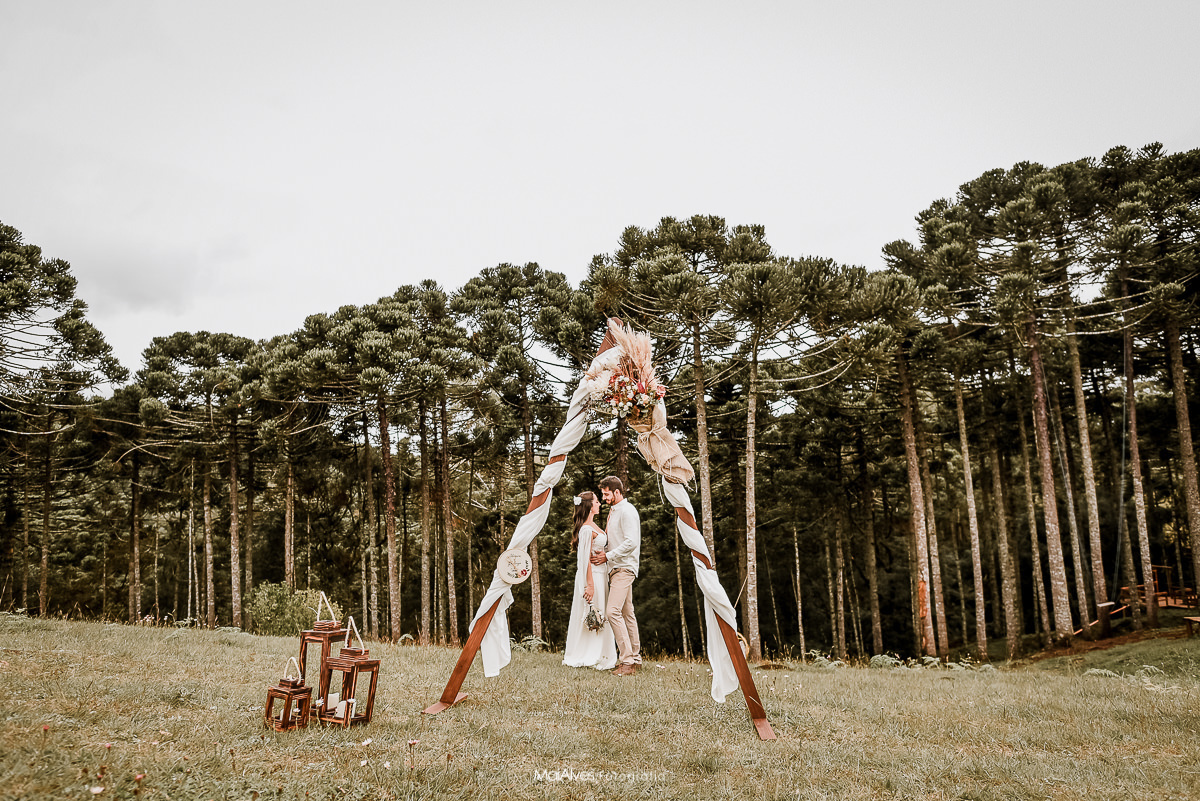 A ideia principal era fazer no canyon fortaleza, como a previsão do tempo era de chuva, decidimos fazer na pousada onde estavam hospedados, onde tem um espaço incrível, uma floresta de araucárias, que deixou a cerimonia ainda mais encantadora, e com um charme especial, além de cada detalhe feito com muito amor pela Adri.
