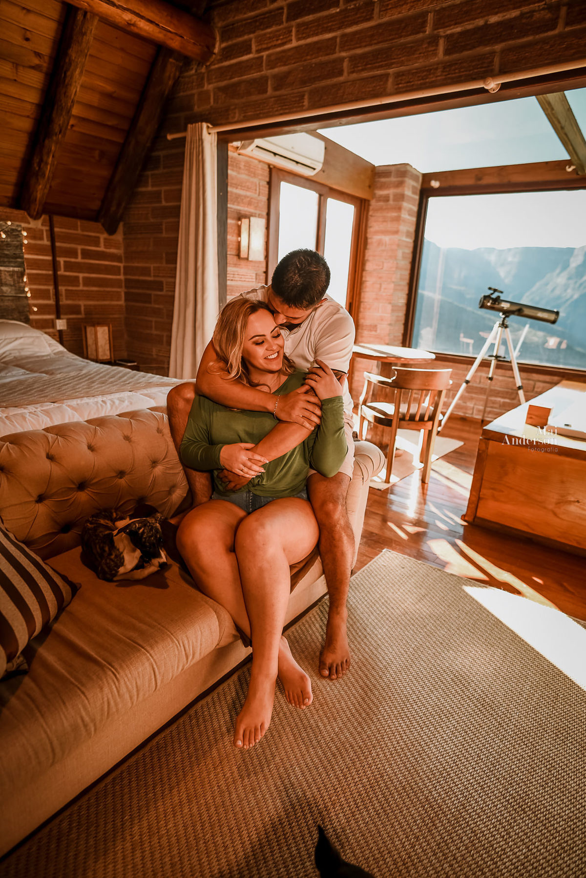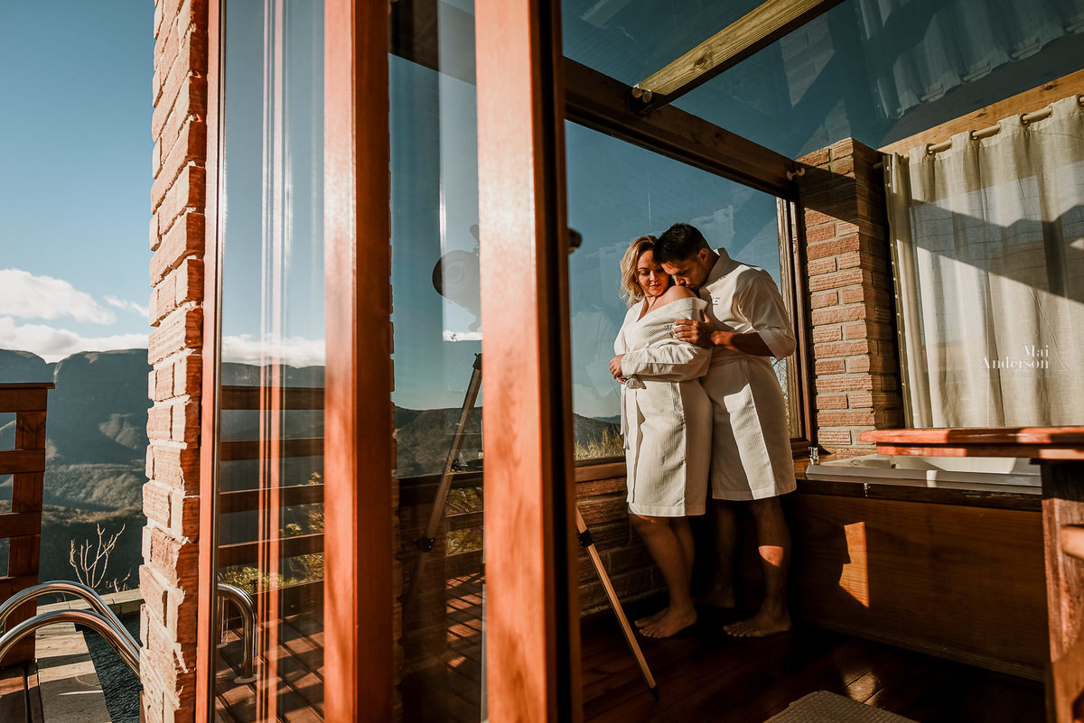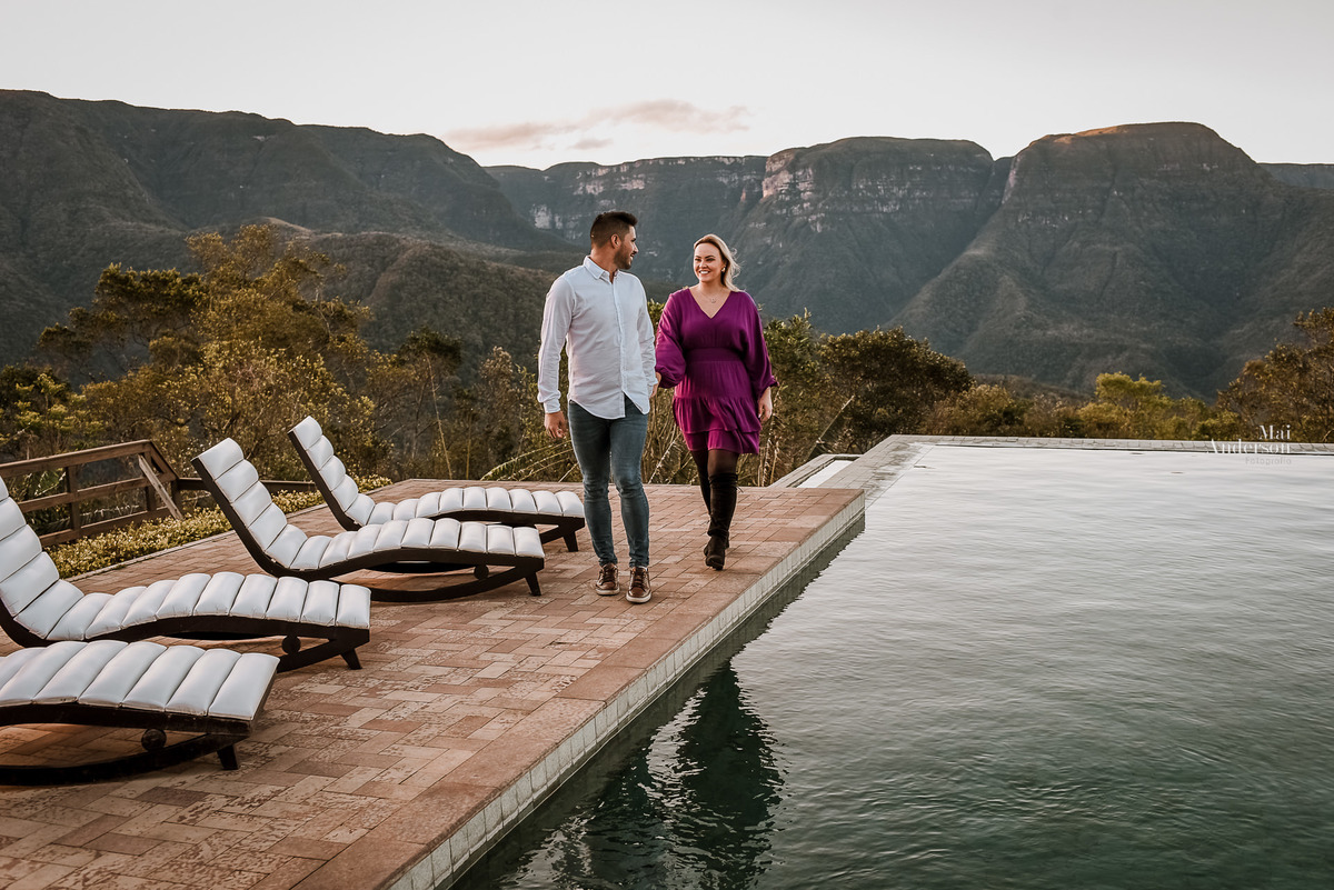 Na rua o vento estava forte, então a maior parte do nosso ensaio foi dentro do chalé, mas ao sair na rua, a luz estava perfeita, então enfrentamos o ventinho, e fomos realizar algumas fotos, na área da piscina, mirante e valeu em, ficou perfeito!